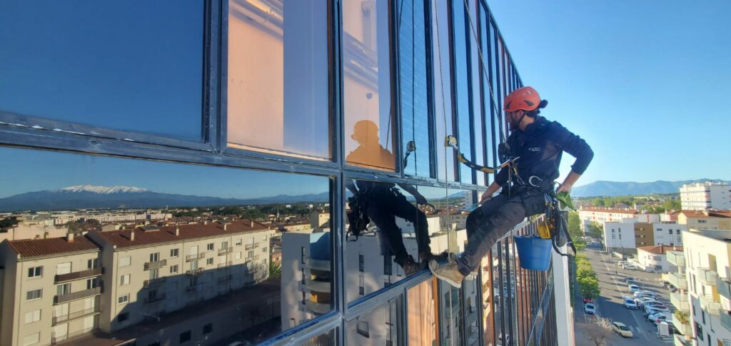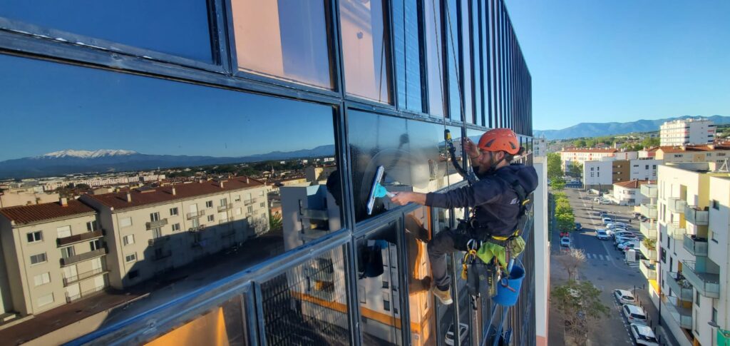 Nos techniciens cordistes assurent le nettoyage régulier des surfaces vitrées sur des bâtiments de grande hauteur à Perpignan. L’utilisation des techniques de travaux sur cordes permet d’intervenir avec rapidité et efficacité sur des façades complexes, tout en garantissant un résultat impeccable. Un entretien périodique est essentiel pour préserver l’éclat et la transparence de vos structures vitrées.